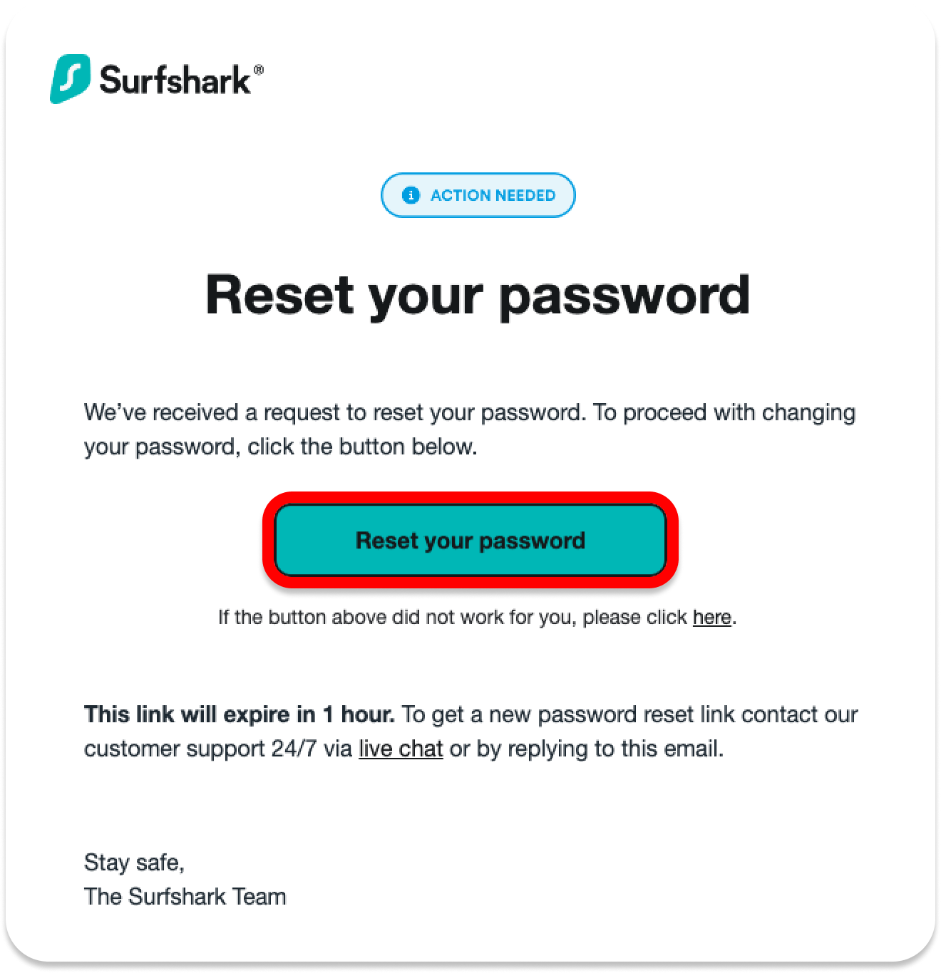 NOTE: This method works for resetting your password even if you had no password since registering. - Head to your email inbox, where you'll find a letter from Surfshark named Reset password instructions. Open this letter and press Reset your password.