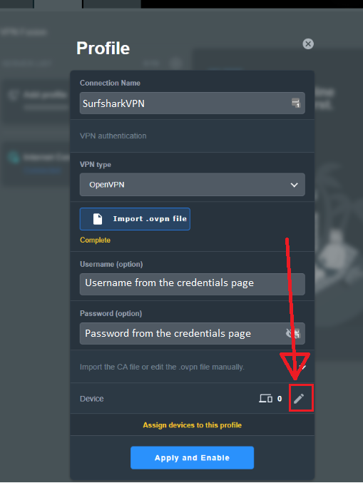 - Configure which devices get affected by the freshly configured VPN tunnel. To do so, click on the edit pen in the Device section.