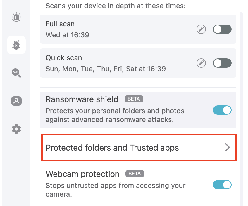 It will protect you from malicious attacks on your device, which try to encrypt your files and ask for payment to decrypt them. Ransomware shield works by monitoring your selected folders that applications try to access to interact with files.