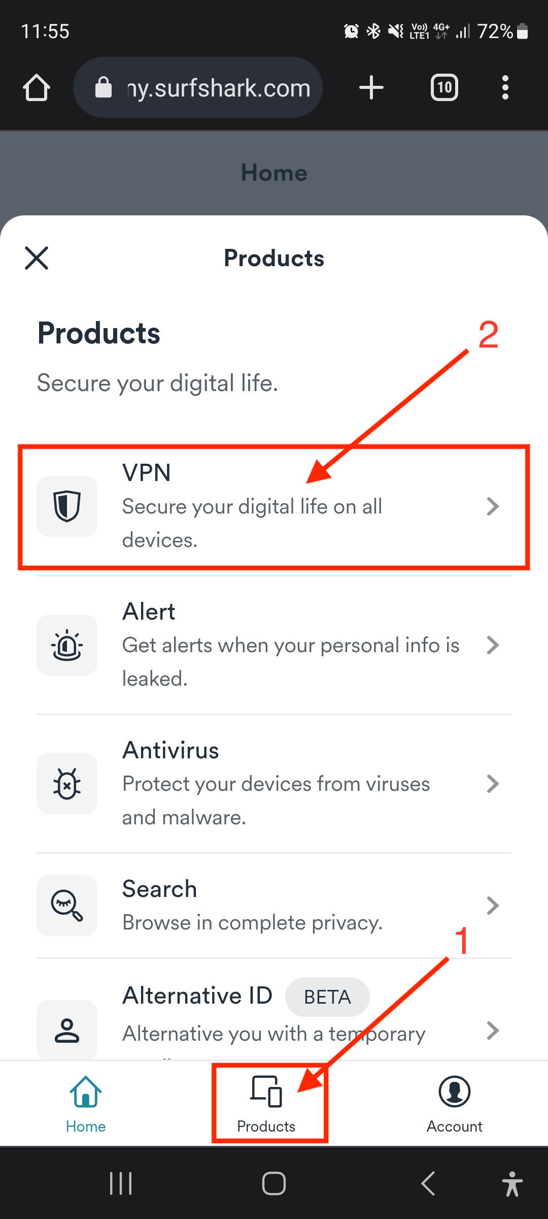 Go to Surfshark's login page and log in. Then, click Products > VPN.