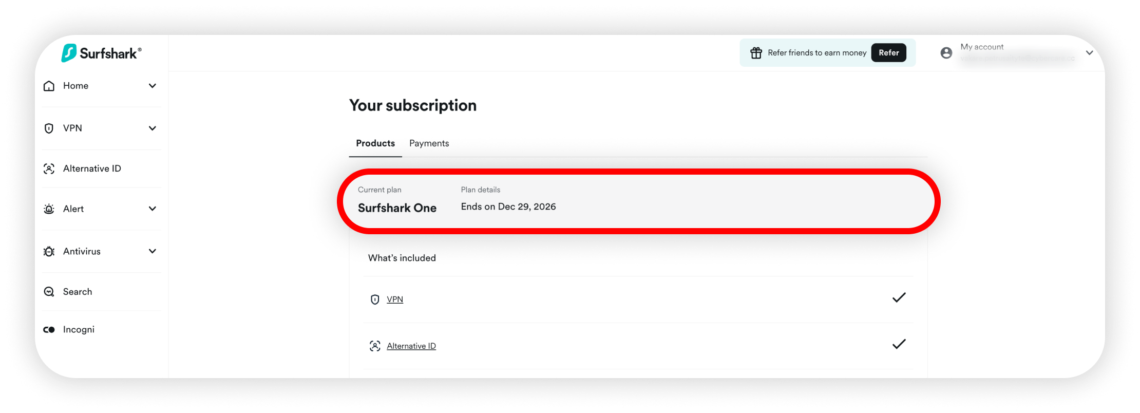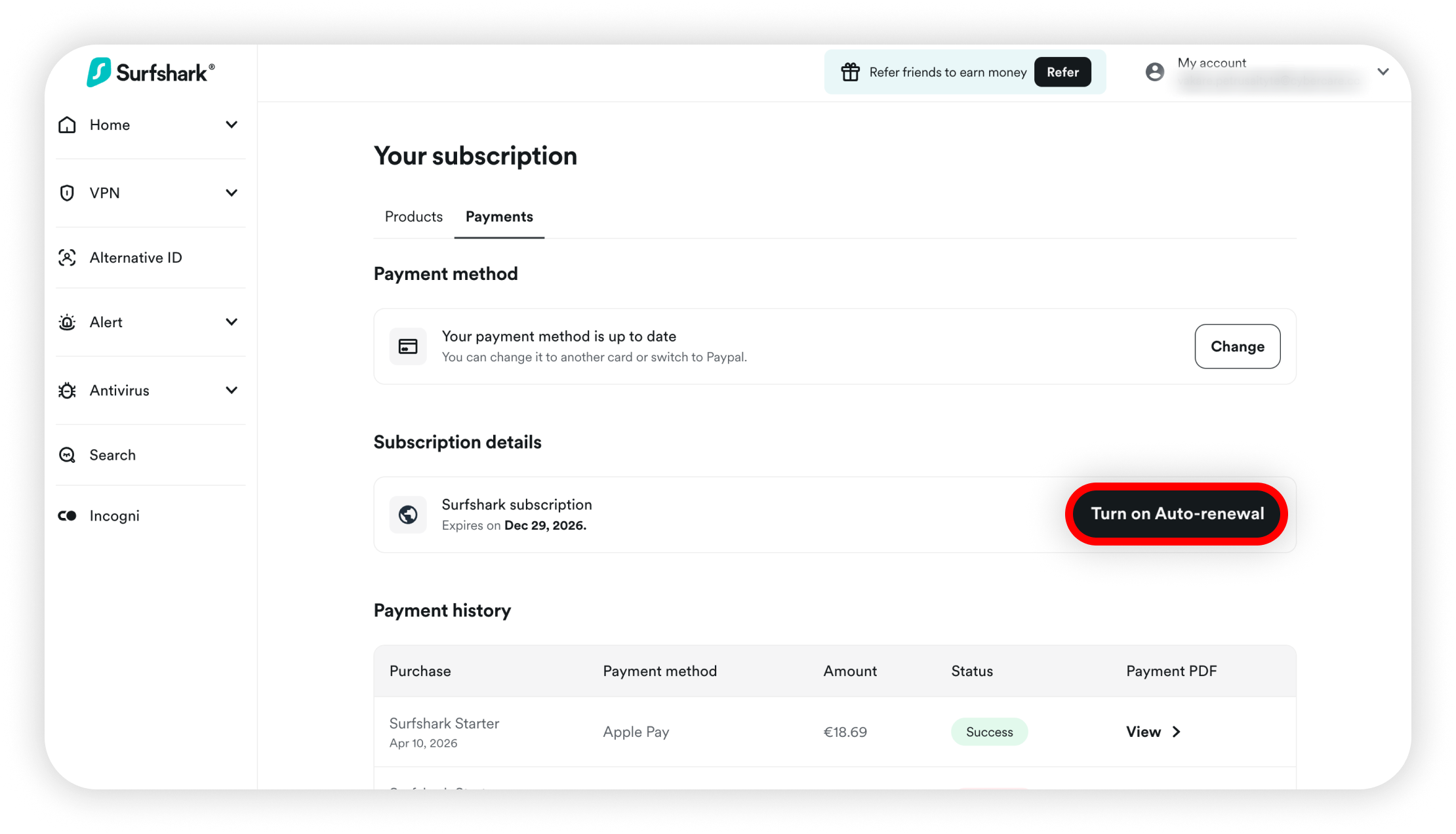 NOTE: Some management options may be unavailable in your Surfshark account if your subscription was purchased through a third‑party provider or a payment method that doesn’t support recurring payments.
