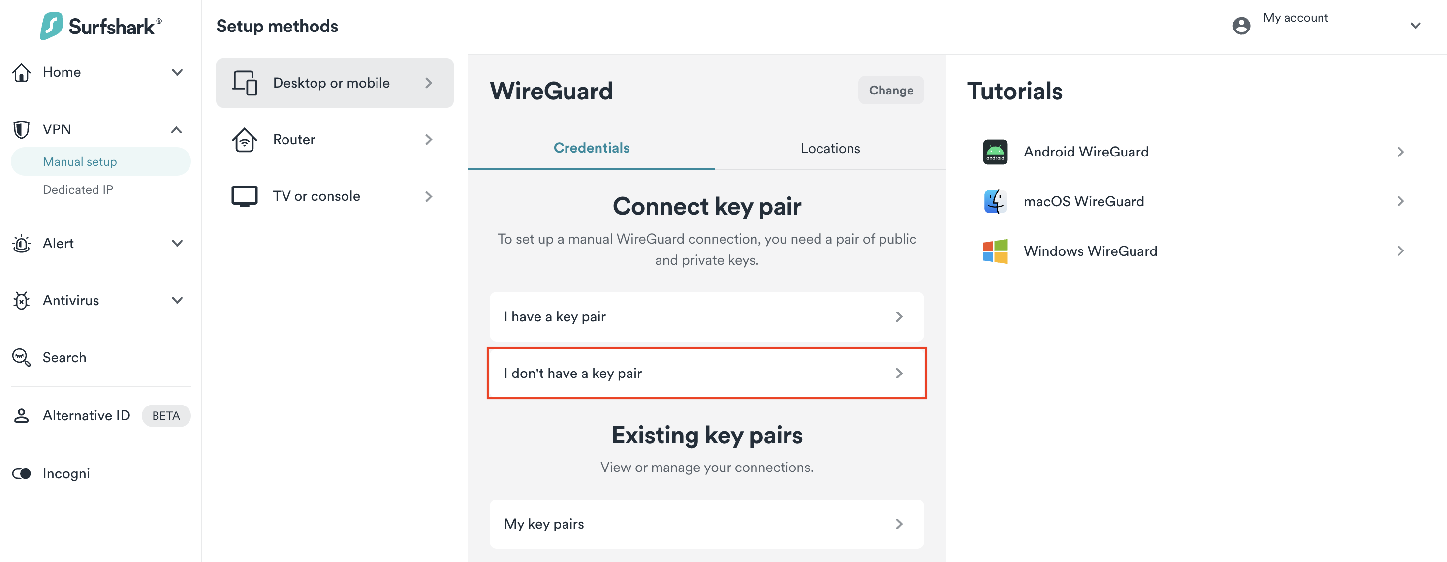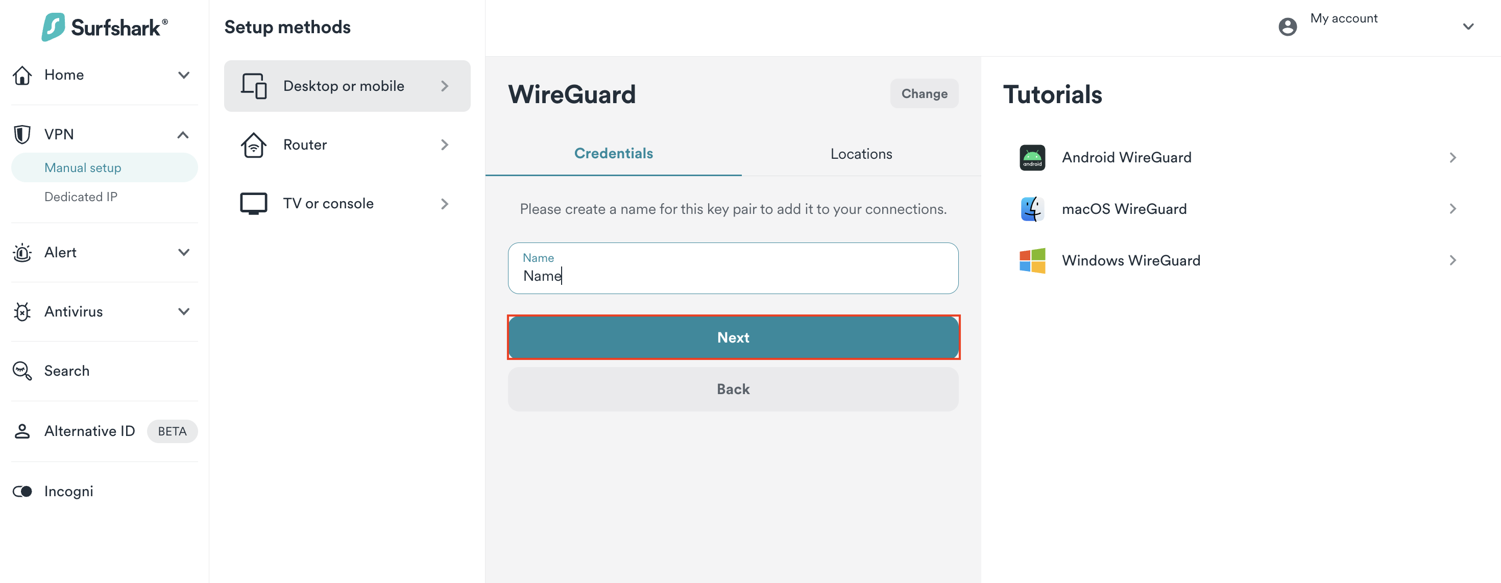 1. Go to Surfshark's login page and log in. Then, visit VPN > Manual setup. Choose the Desktop or mobile option and click on WireGuard.