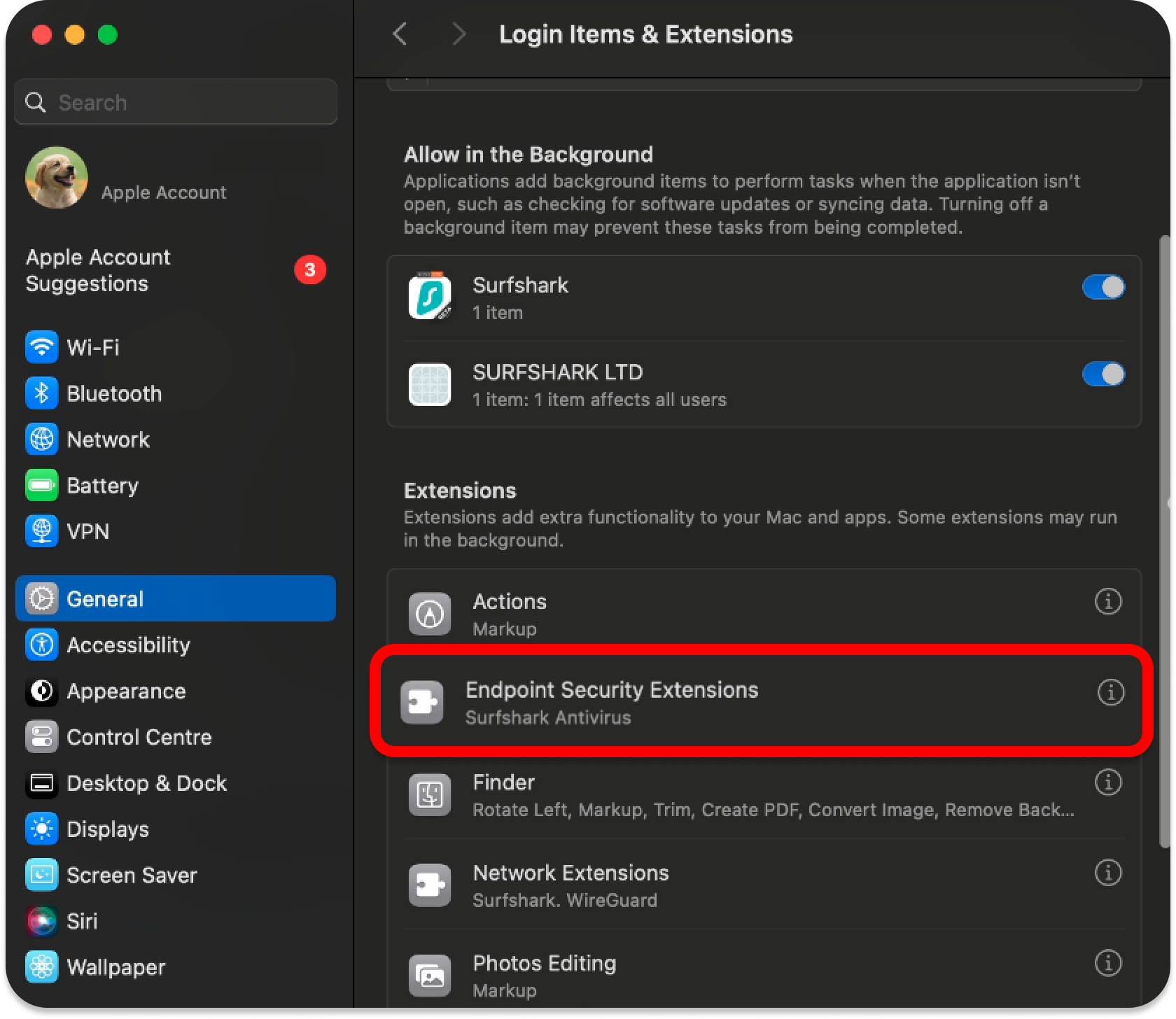 - Select Endpoint Security Extensions and make sure that Surfshark is toggled ON. Once you do, press Done.