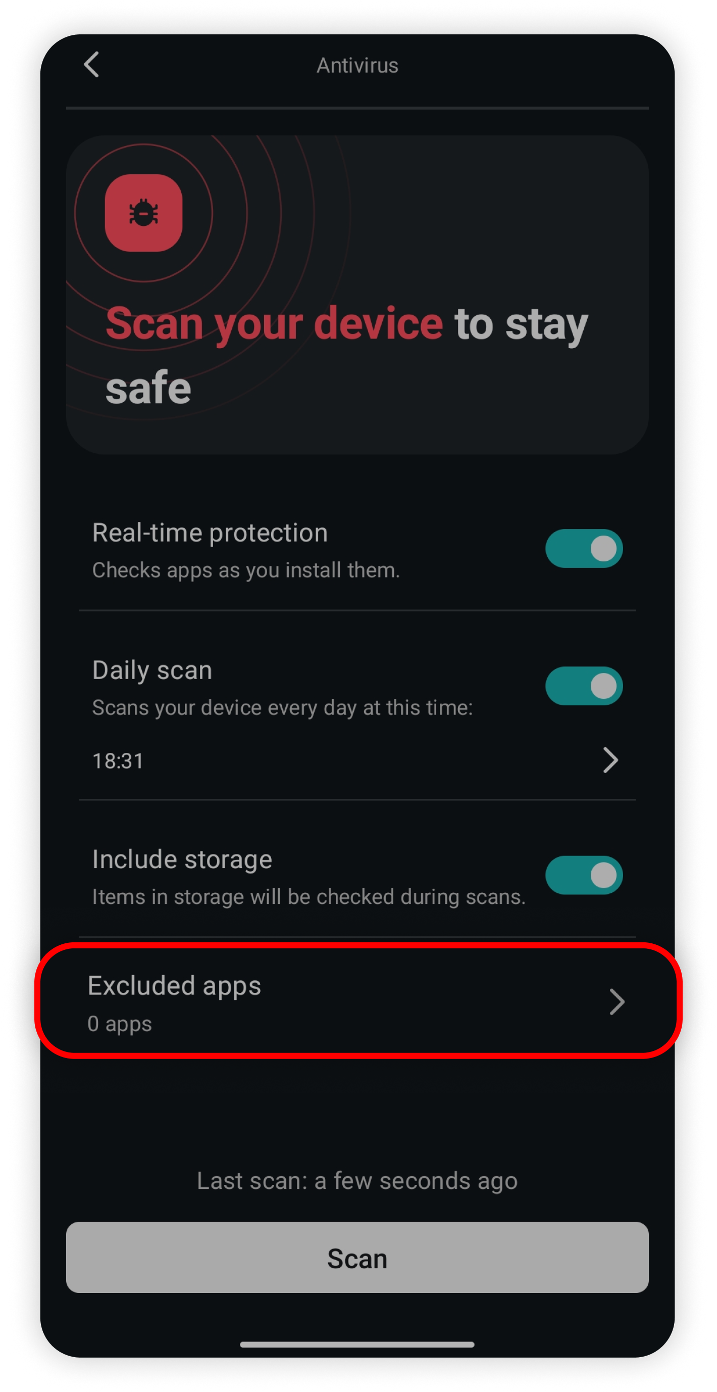 If Surfshark Antivirus is blocking a legitimate application or feature, adding it to the exclusion list can help resolve the issue. Exclusions allow trusted apps or files to run on your device without interference. To add an exclusion in Surfshark Antivirus on an Android device, follow the steps below: