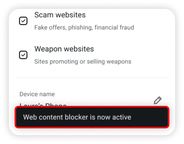 NOTE: As long as the web content blocker feature is on, you cannot access any of the website categories you selected to block.
