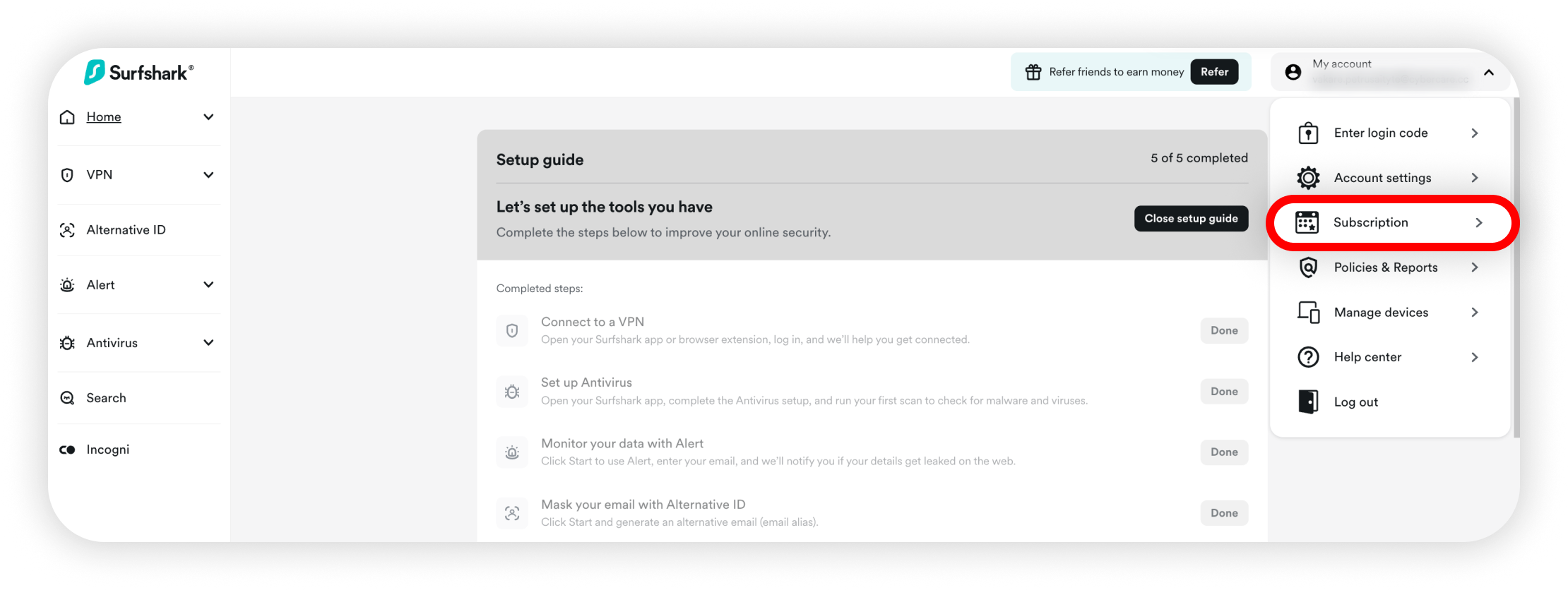 NOTE: Cancelling your subscription's auto-renewal does not automatically grant a refund – it stops your subscription's auto-renewal and recurring payments. If you purchased our services within the last 30 days and wish to receive a refund, please refer to our article on Surfshark refund policy.