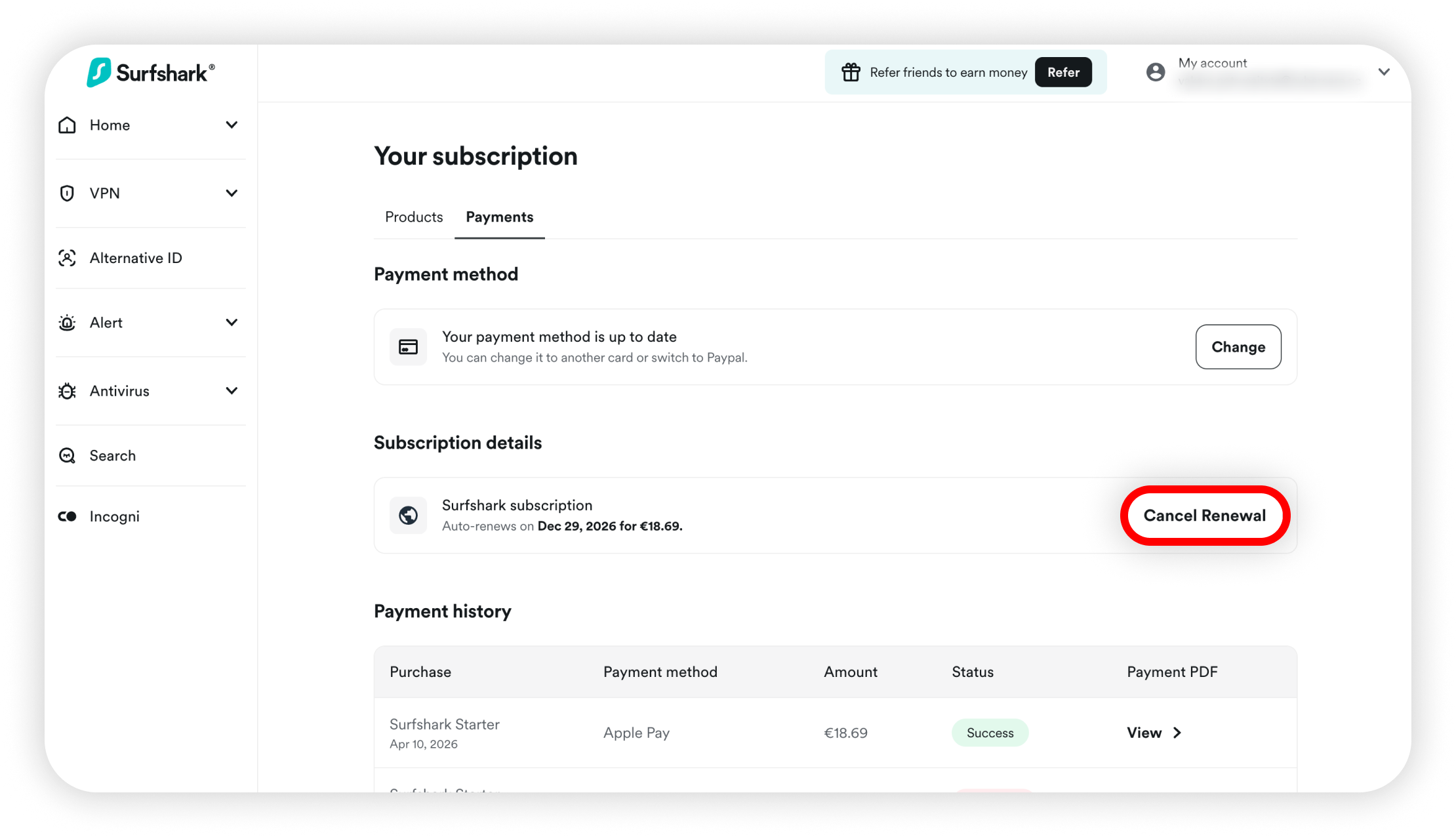 Auto‑renewal can be canceled directly from the Surfshark account. Here's how: