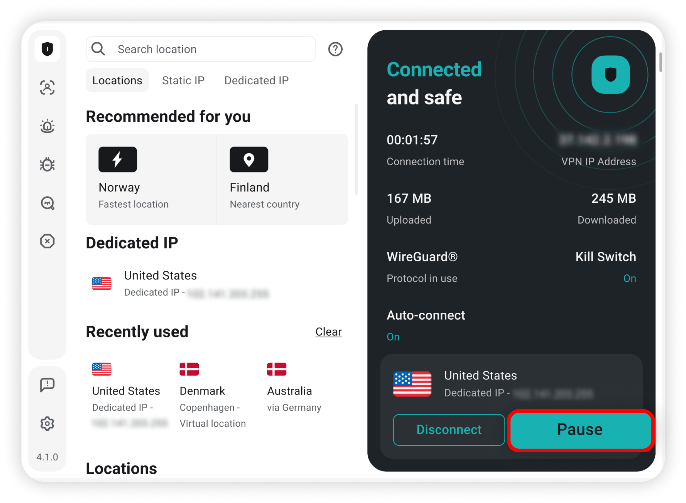 Alternatively, you can also click on pause to temporarily pause the VPN connection: