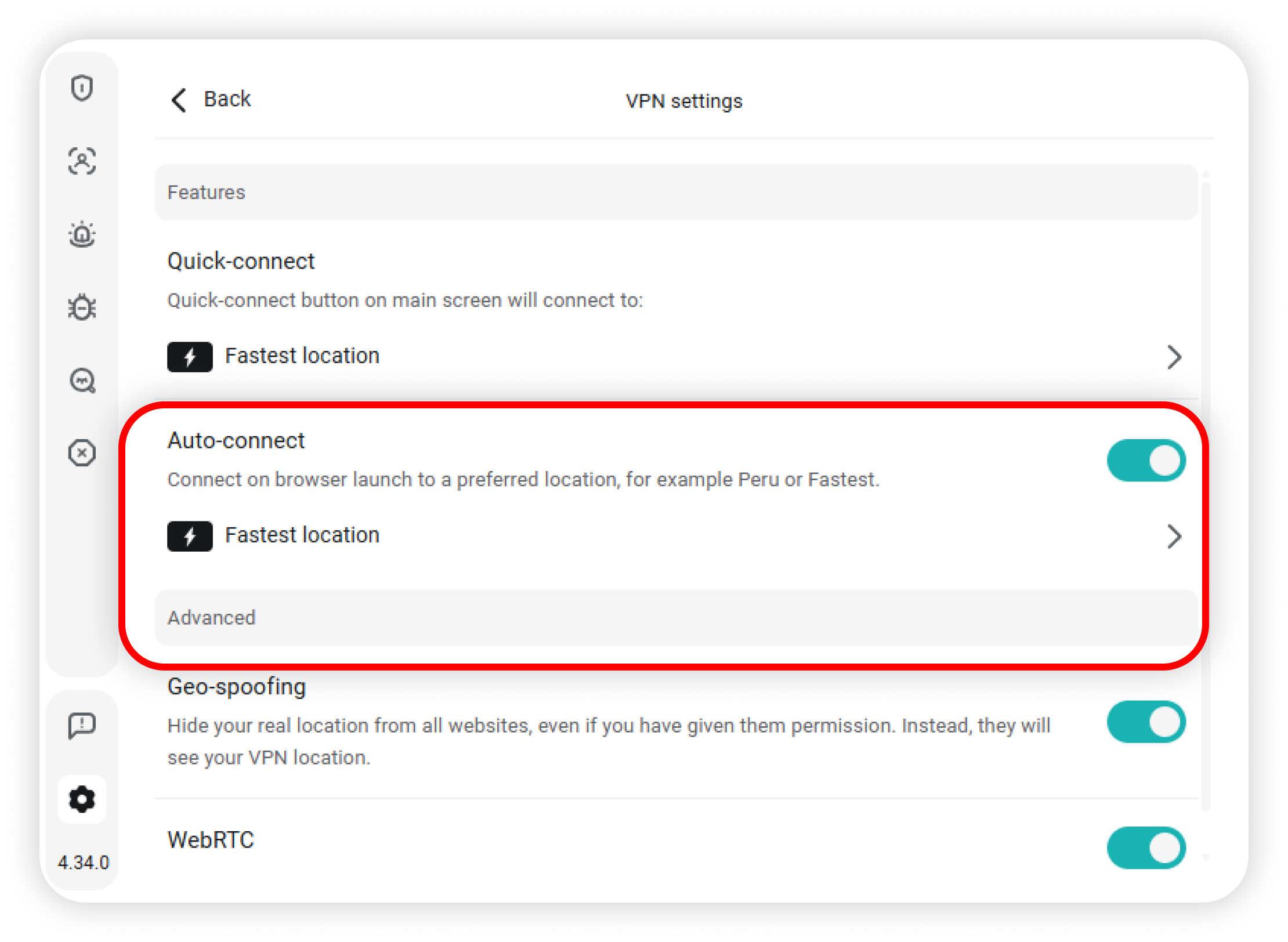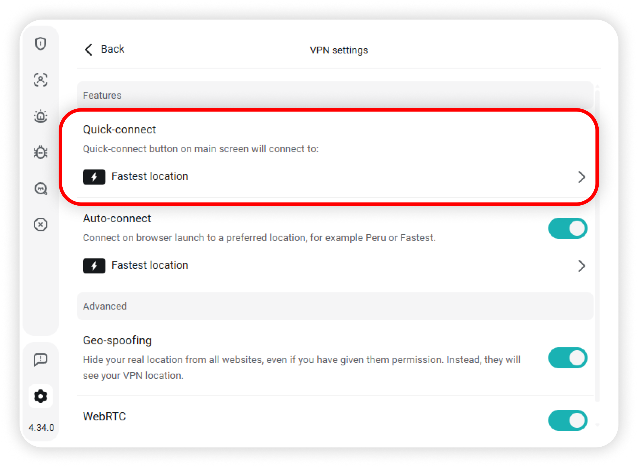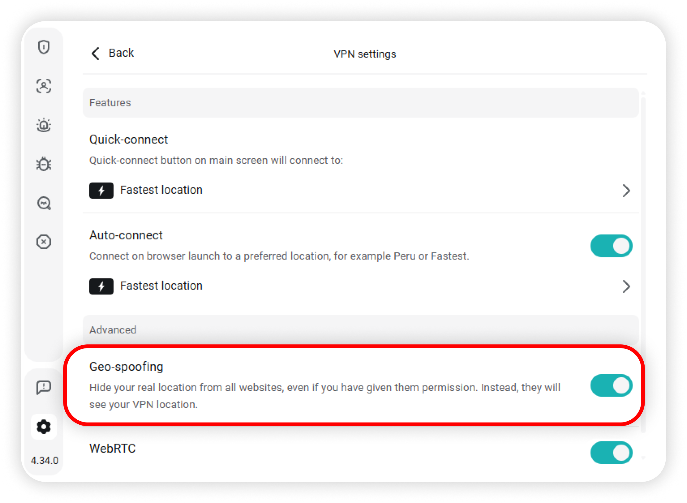 • Toggle the WebRTC feature, which prevents websites from using WebRTC to discover your IP and location: