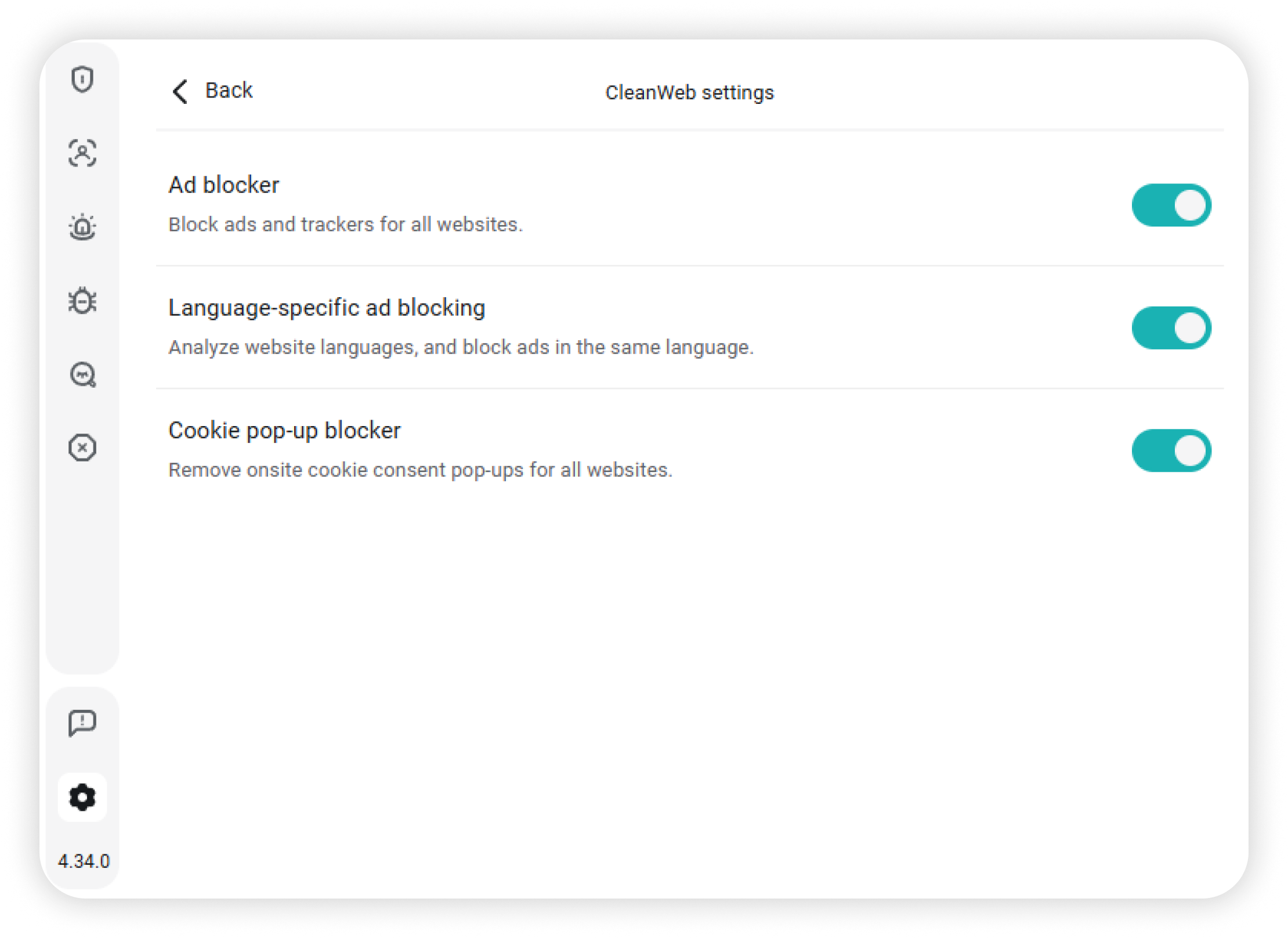 Activate Ad blocker, language-specific blocker and Cookie pop-up blocker to enjoy a cleaner, less interrupted browsing experience.