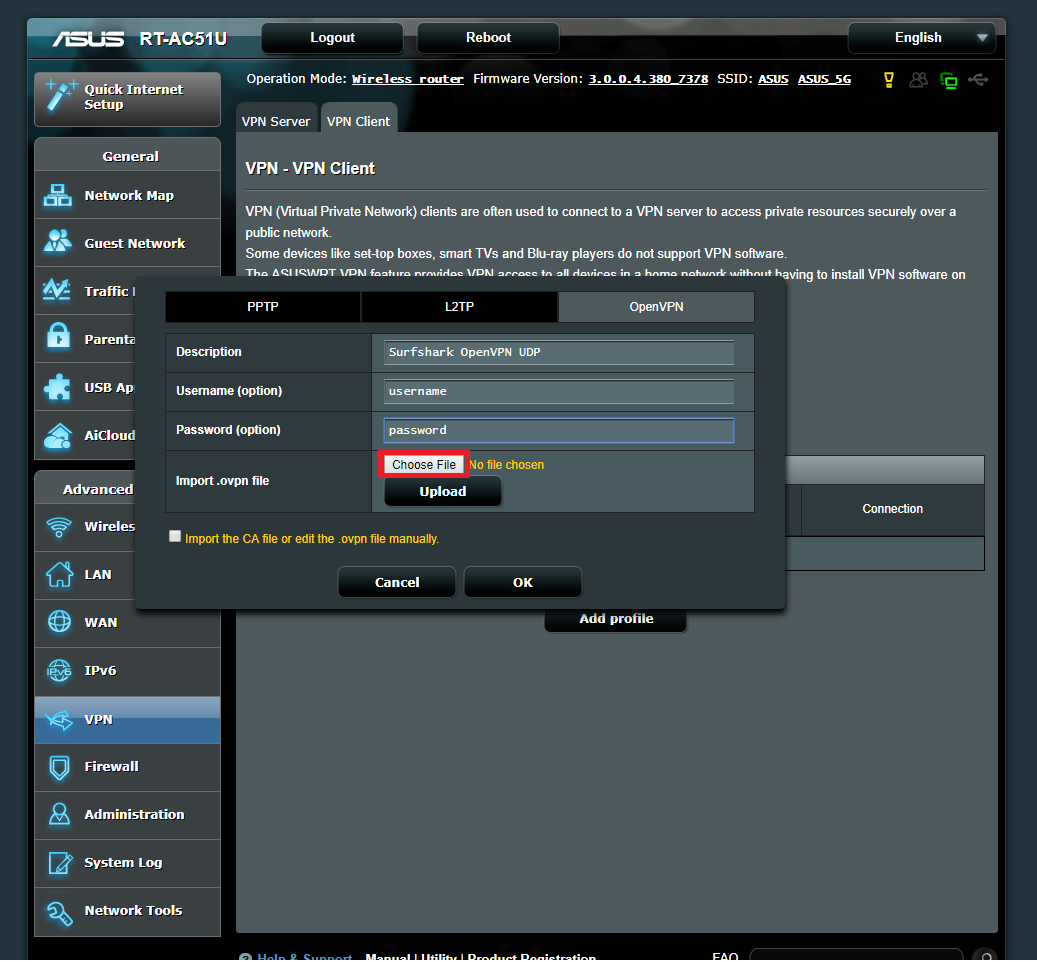 ASUS router VPN profile setup popup with OpenVPN selected and the option to choose an .ovpn file for import.