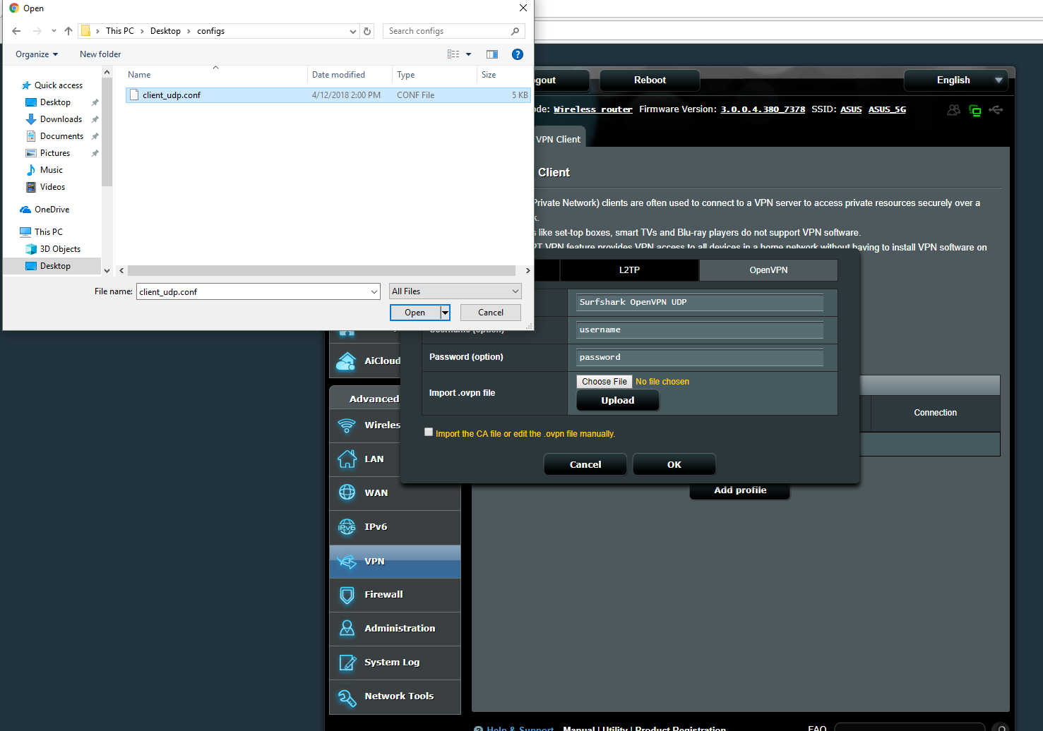 File explorer dialog open on a computer, selecting a client_udp.conf file to upload for OpenVPN profile on ASUS router.
