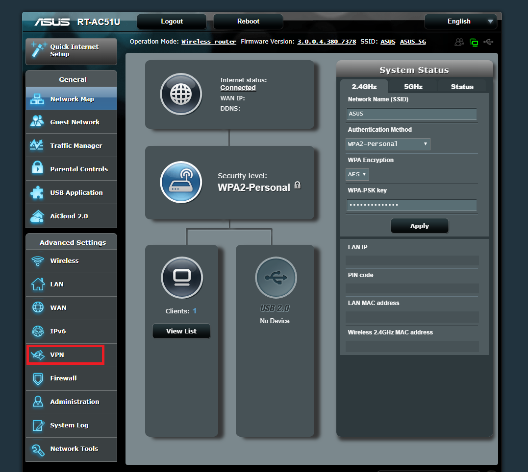 ASUSWRT router dashboard with Network Map displayed and VPN section highlighted in the left menu.