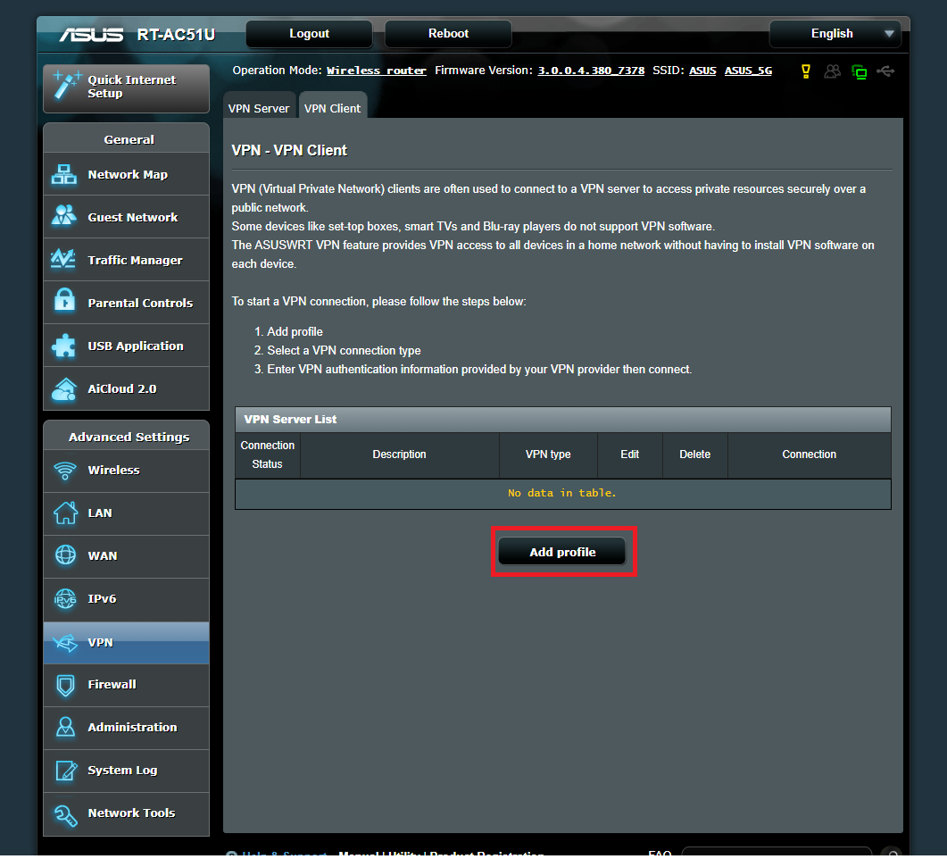 VPN Client page on ASUSWRT with “Add profile” button highlighted for creating a new VPN profile.