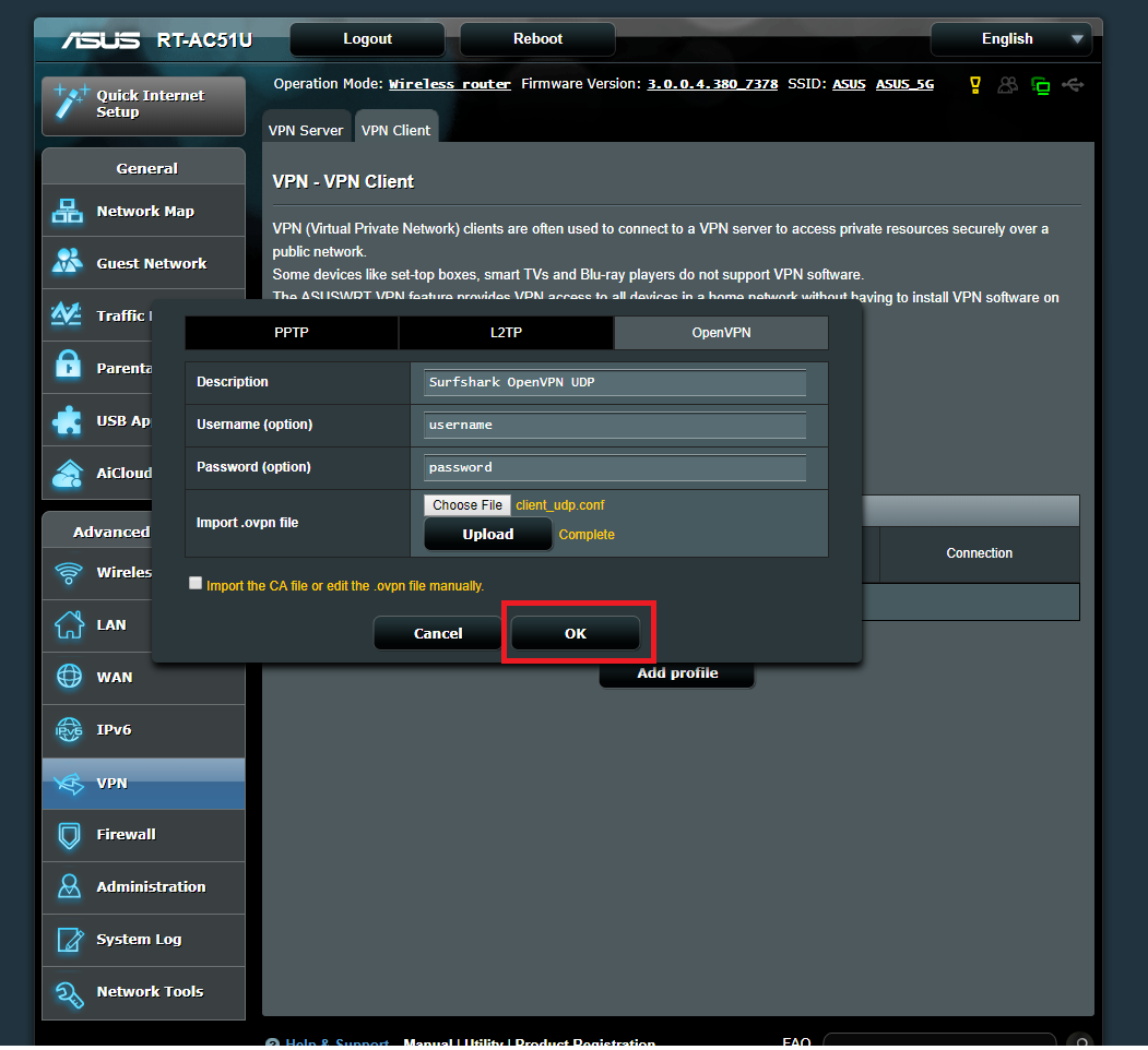 ASUS OpenVPN profile creation screen with the configuration file uploaded and the OK button highlighted.
