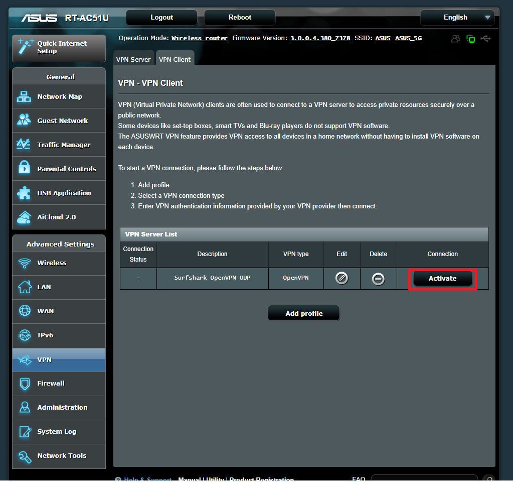 ASUSWRT VPN Client list showing new OpenVPN profile with the Activate button highlighted to start the VPN connection.