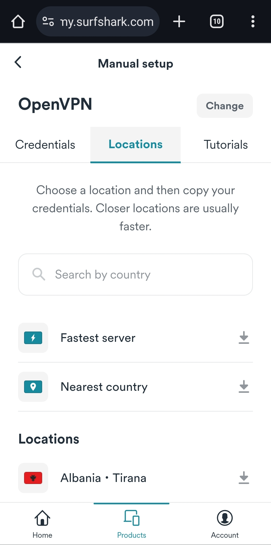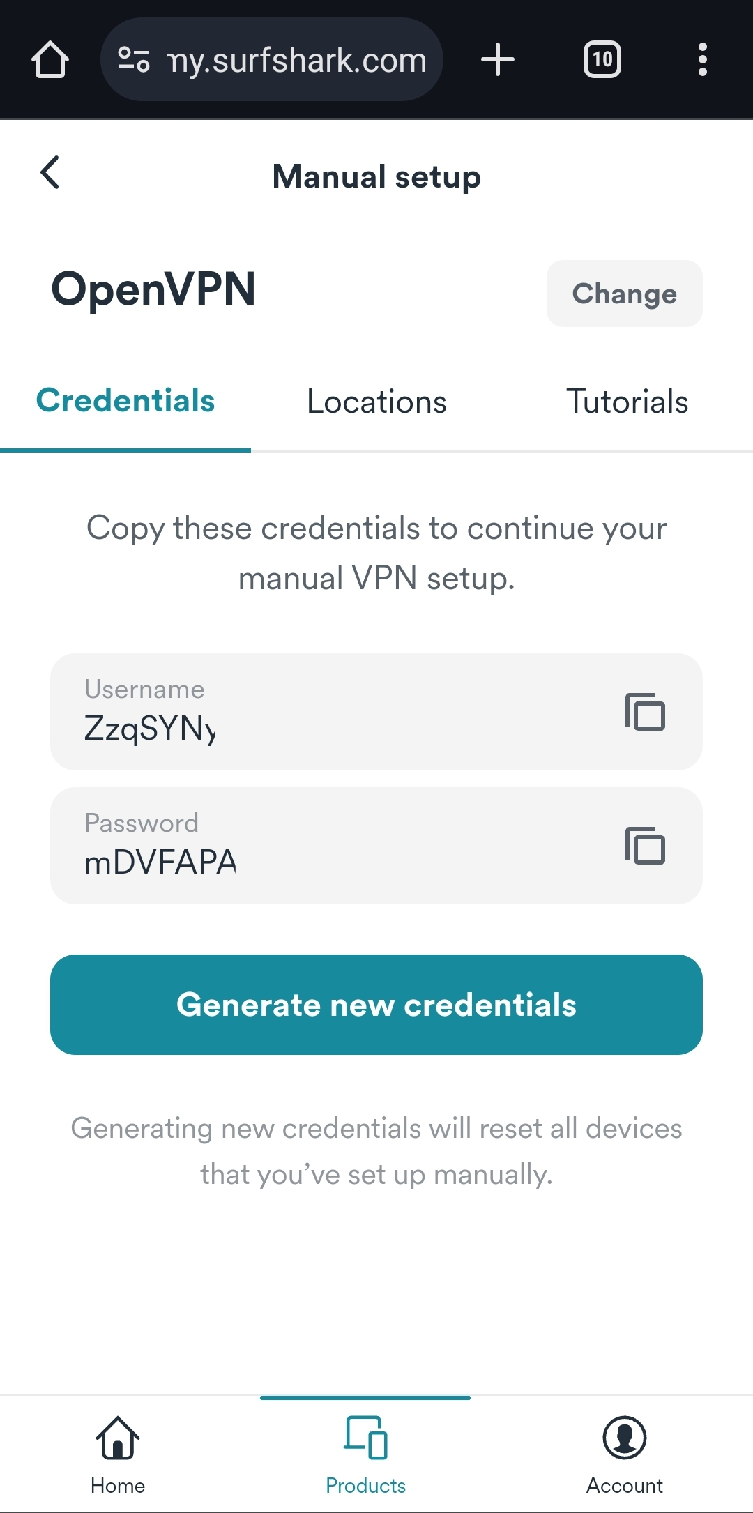 - Go to the Surfshark login page and log in. Tap on Produtcs > VPN > Manual setup > Desktop or mobile > OpenVPN