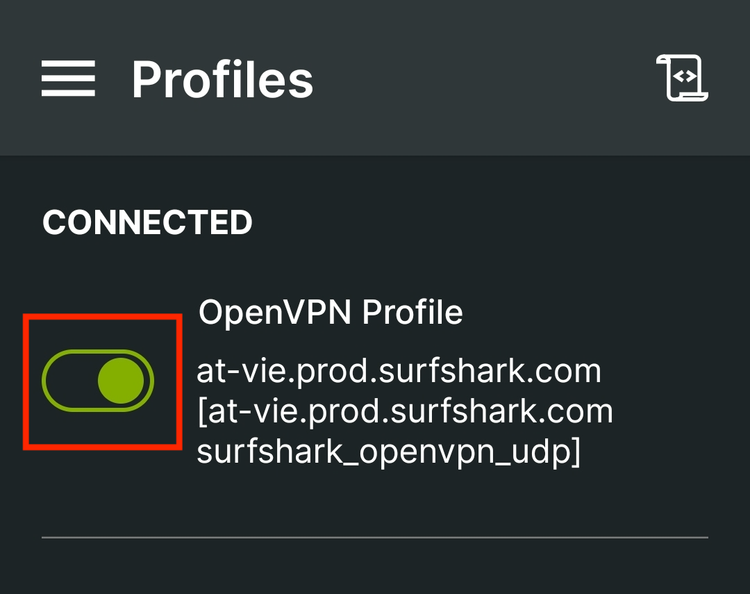 It shows that you're connected, as well as some details about the connection. - To disconnect from the VPN, tap on the switch (which is green now). As soon as you disconnect, the switch will turn gray.