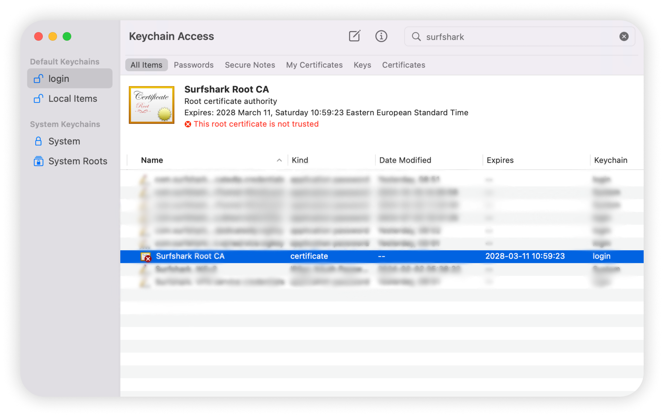 10. Locate the Surfshark Root CA certificate in the list, then right-click it and select Get Info.