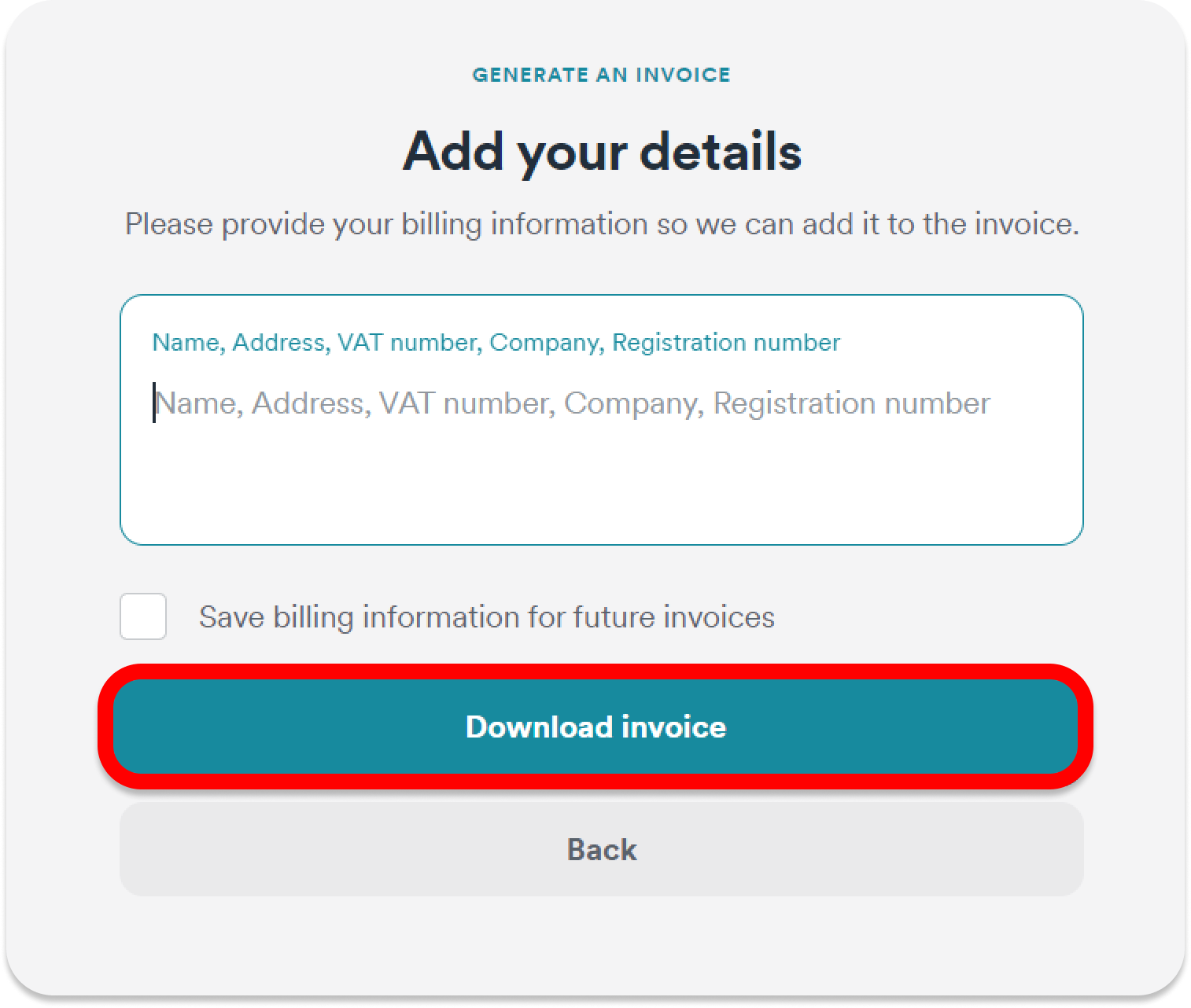 - Fill in the details needed and click Download invoice.