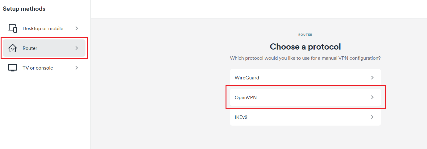 Enter the Surfshark login page and log in. Then, click on VPN > Manual Setup > Router > OpenVPN to generate your credentials.