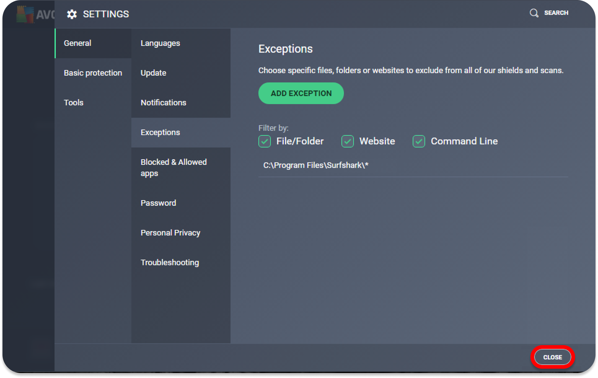 To make an exception for Surfshark in the AVG Antivirus settings, follow these steps: