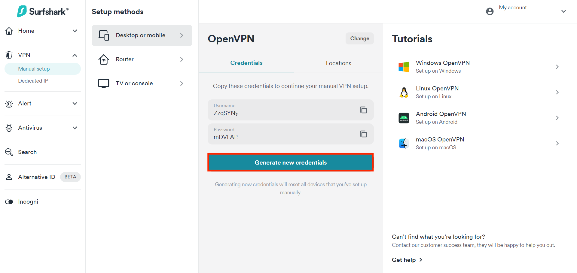 - Enter the Surfshark login page and log in. Then, click on VPN > Manual Setup > Desktop or mobile > OpenVPN to generate your credentials.