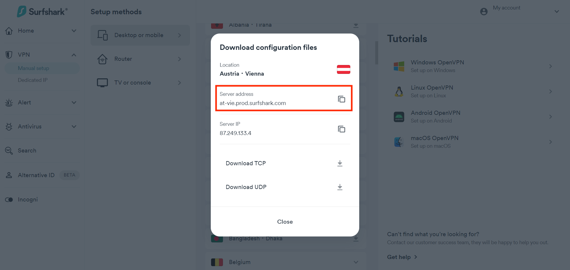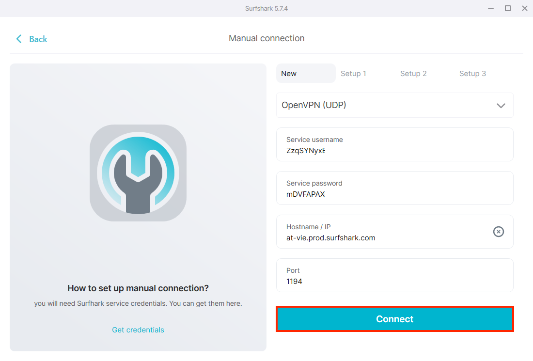 Service username: Surfshark service username (refer to Get your credentials section in this article)Service password: Surfshark service password (refer to Get your credentials section in this article)
