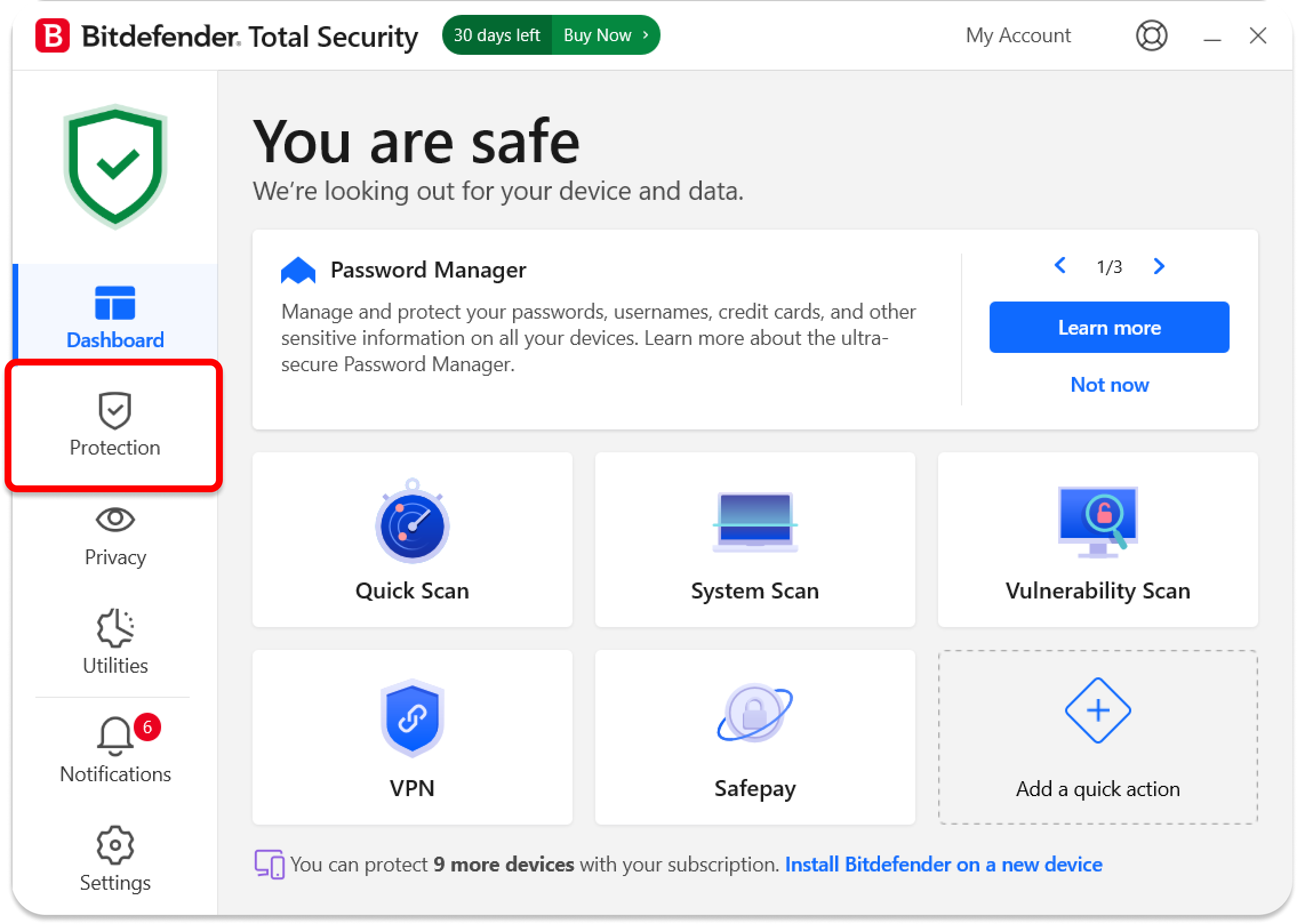 Open the BitDefender application and go to the Protection tab on the left side of the app.