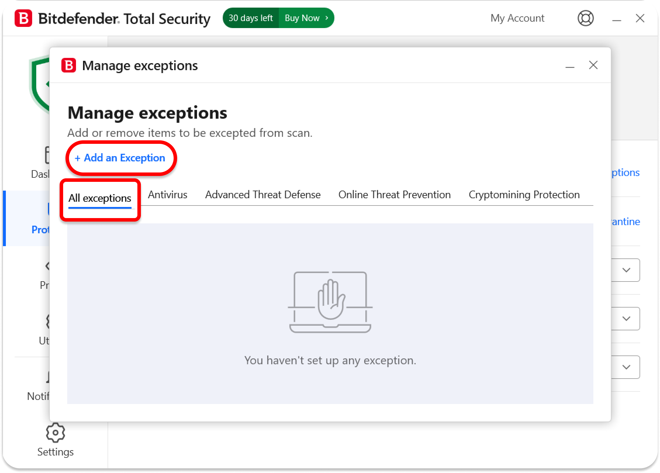 To make an exception for Surfshark in BitDefender antivirus settings, follow these steps:
