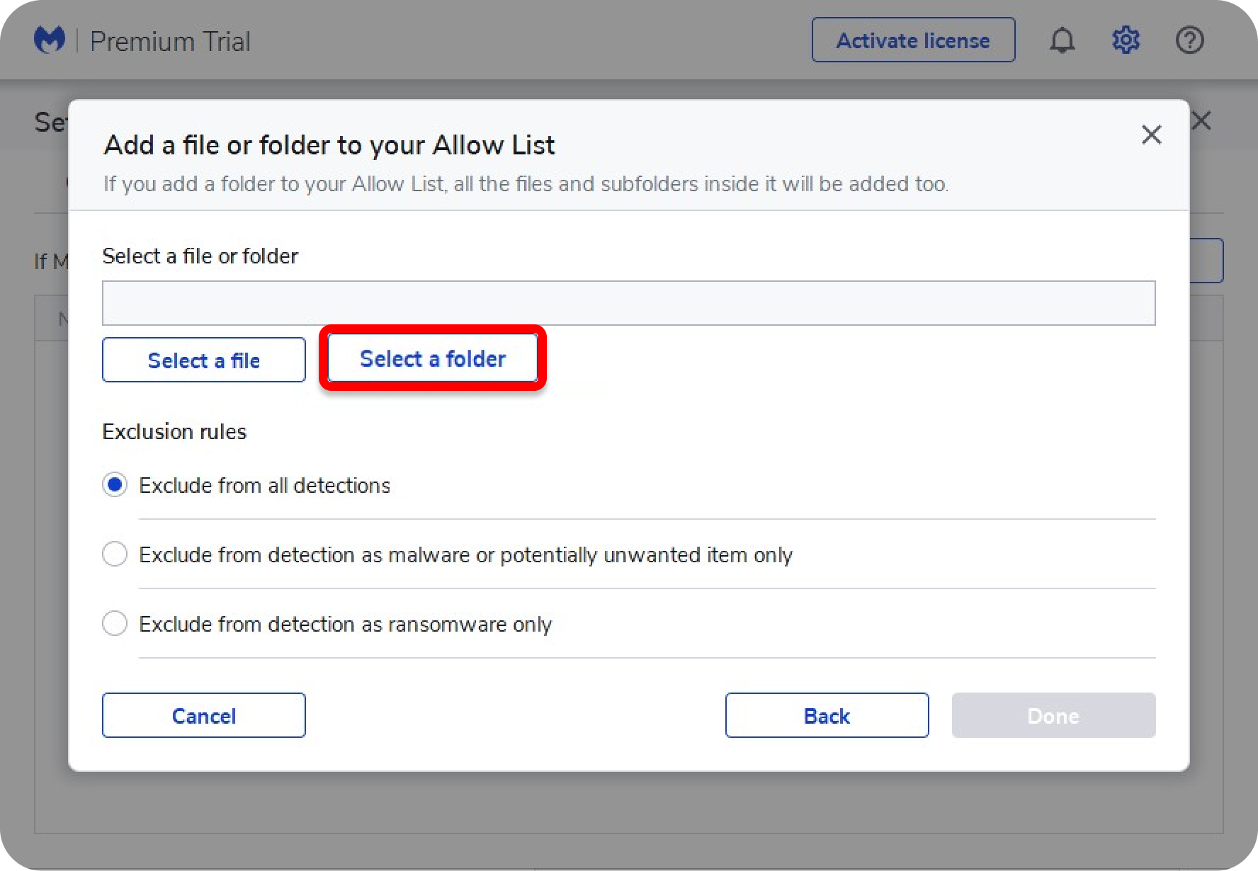 Make sure that the Exclude from all detections option is selected, and click Done.