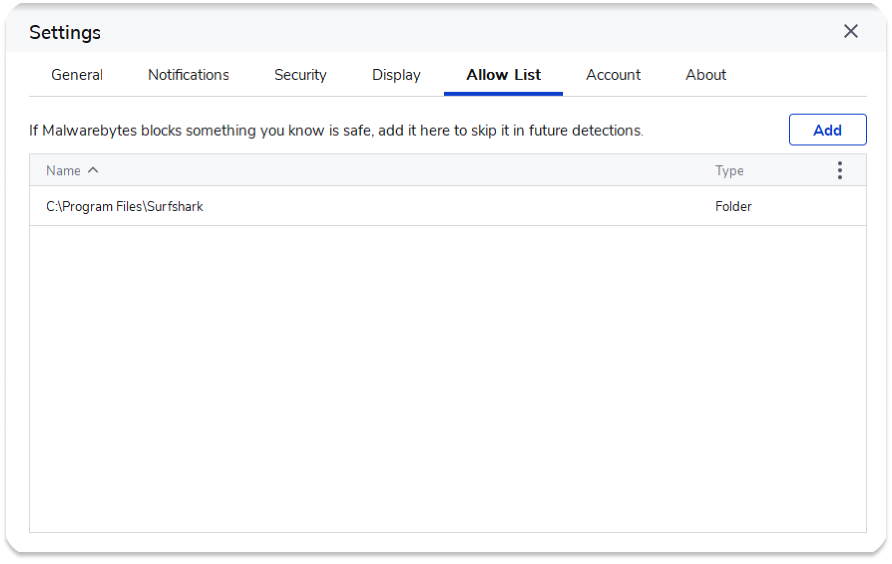 The Surfshark folder will appear on your Malwarebytes exception list.