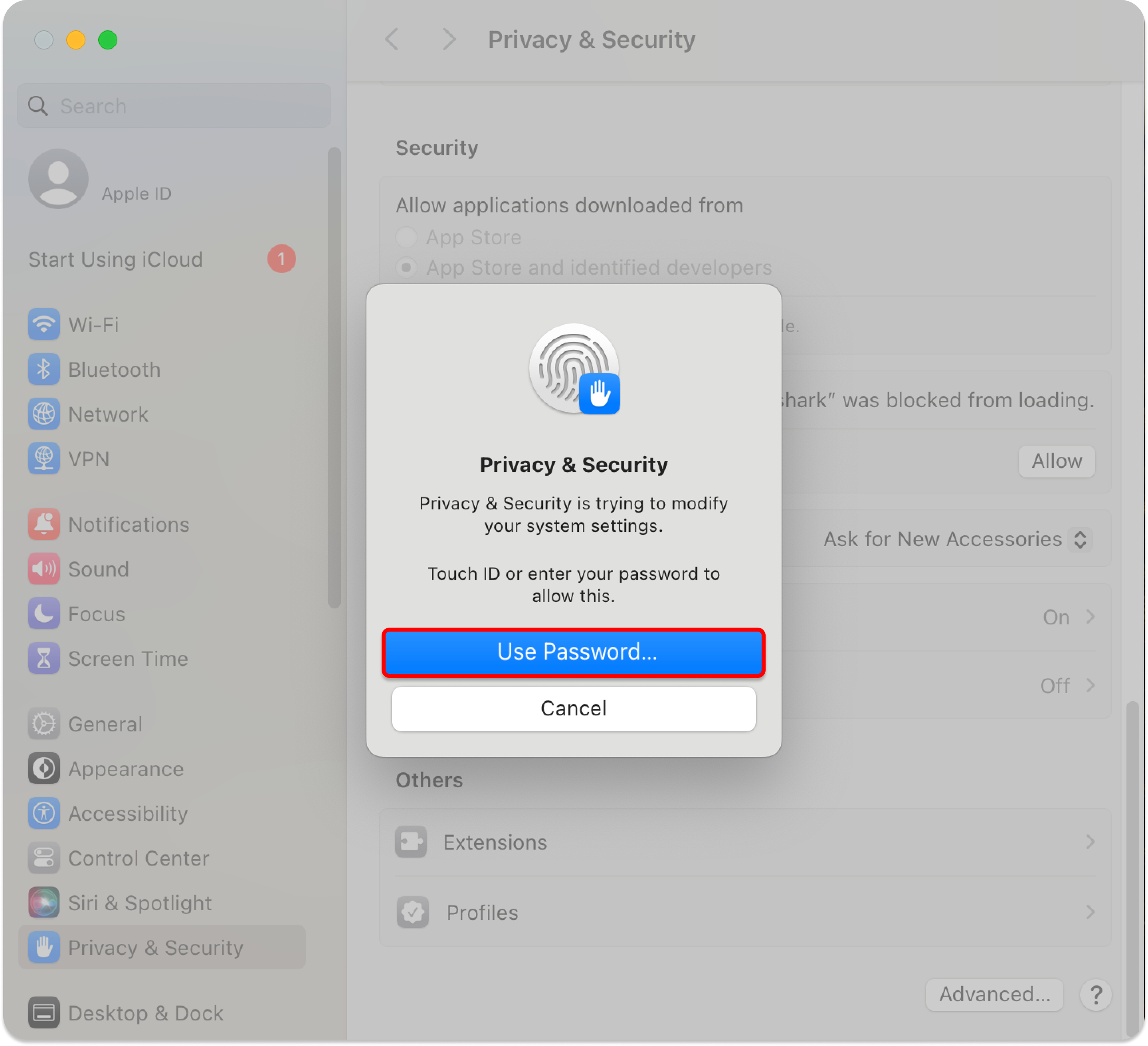 When you attempt to connect for the first time, a system pop‑up will appear. Click Open Security Preferences: