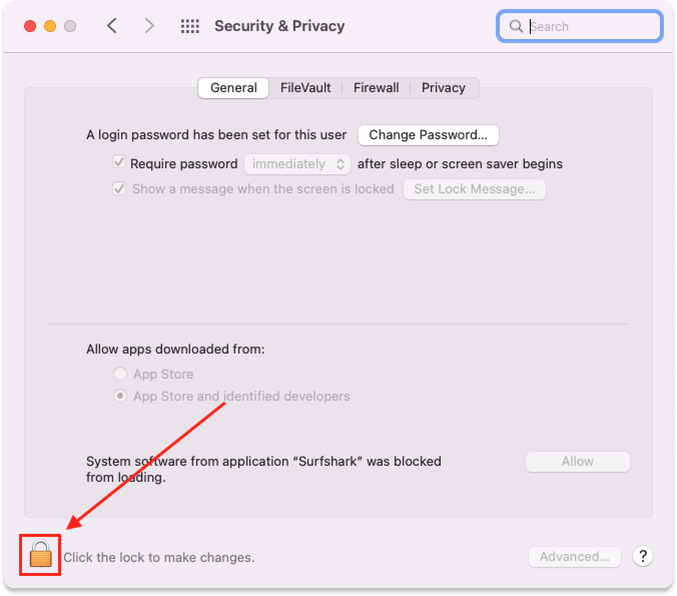 In the Security & Privacy window, click the lock icon in the bottom-left corner of the screen: