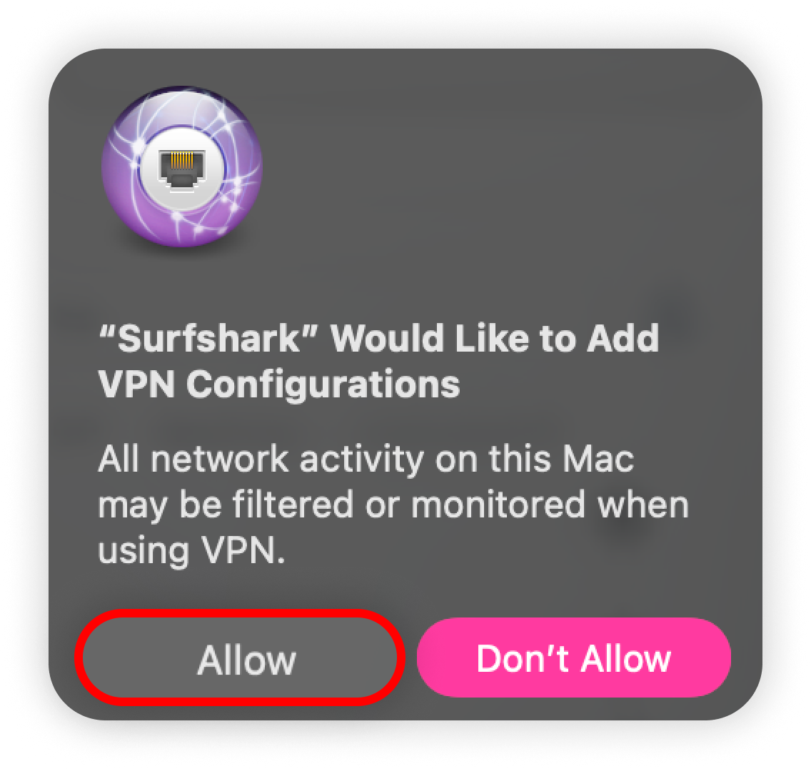 When prompted, approve adding Surfshark to your VPN configurations by clicking Allow: