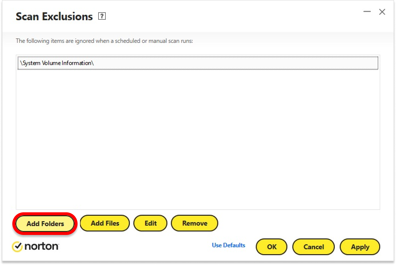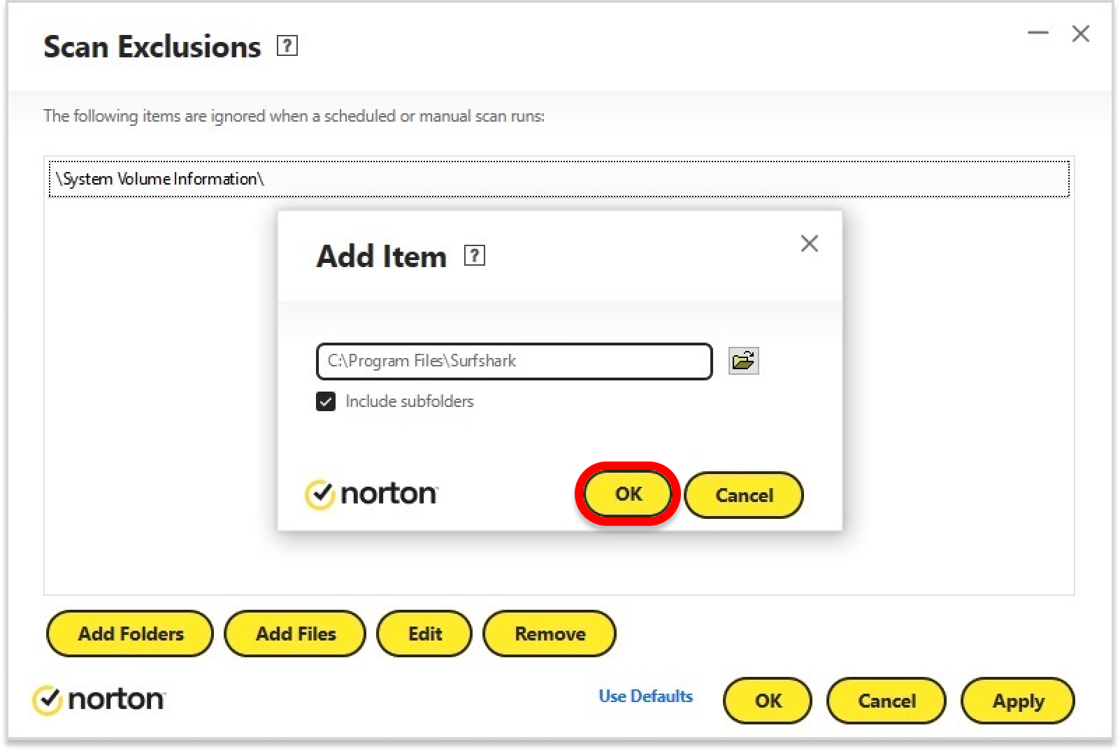 Now, the pathway to Surfshark's folder should be visible in the Scan Exclusions window. All that is left to do is to press Apply and OK to save the exclusion you have just added.