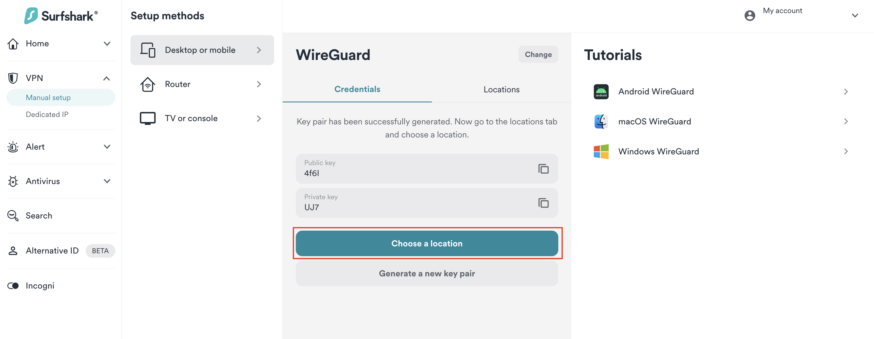 Once you have your key pair, you should see a Choose a location button. Click on it. Here, you'll find the list of available locations to connect to. Select one and hit the download button.