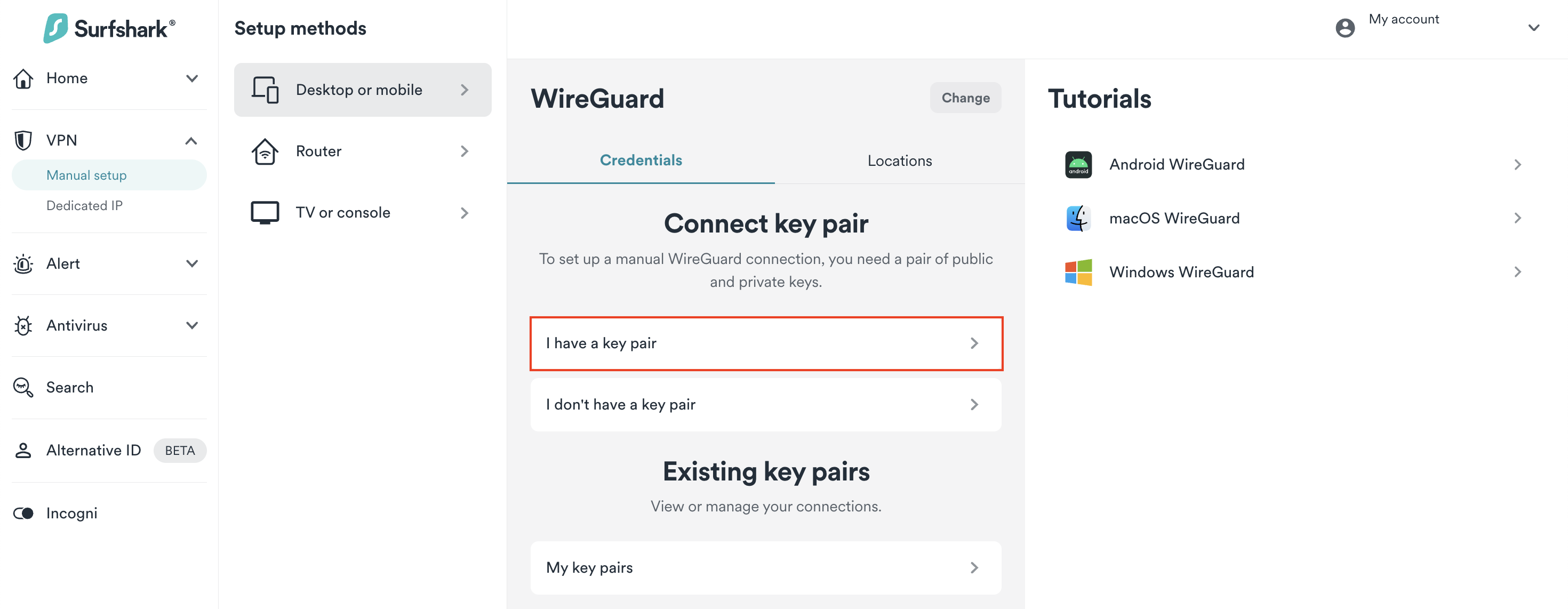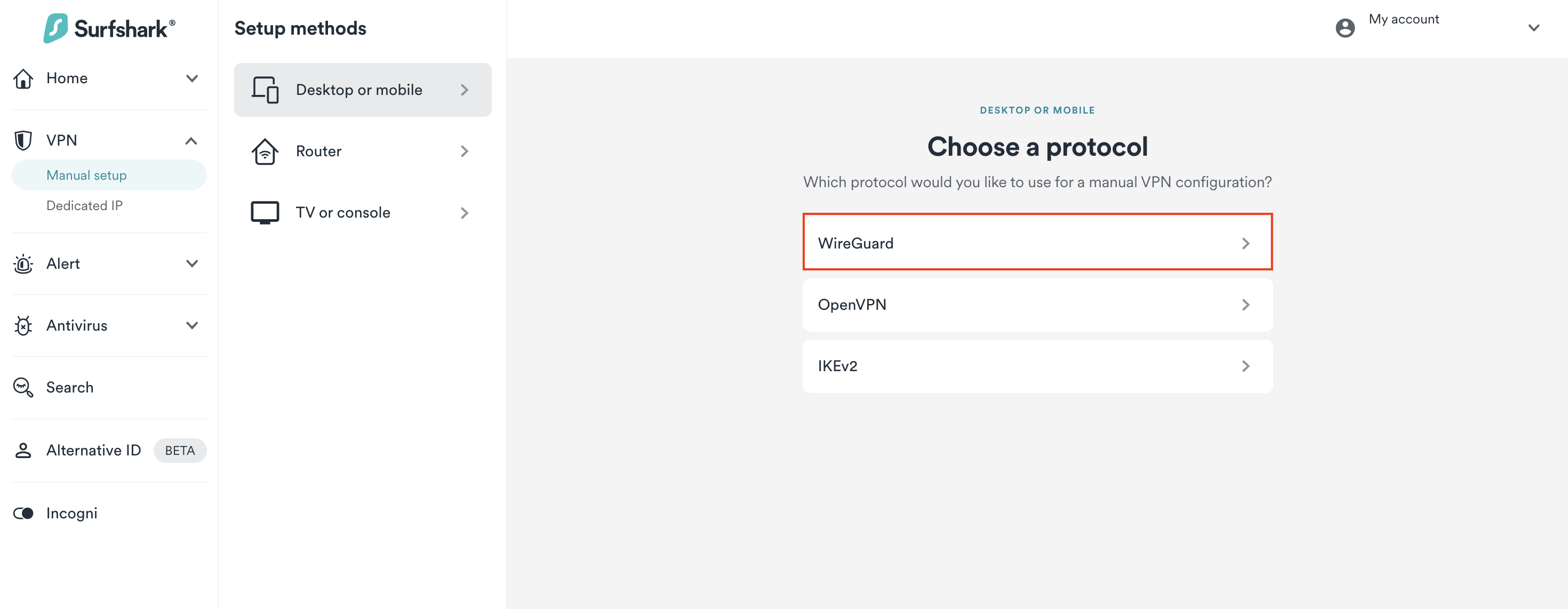 1. Go to Surfshark's login page and log in. Then, visit VPN > Manual setup. Choose the Desktop or mobile option and click on WireGuard.