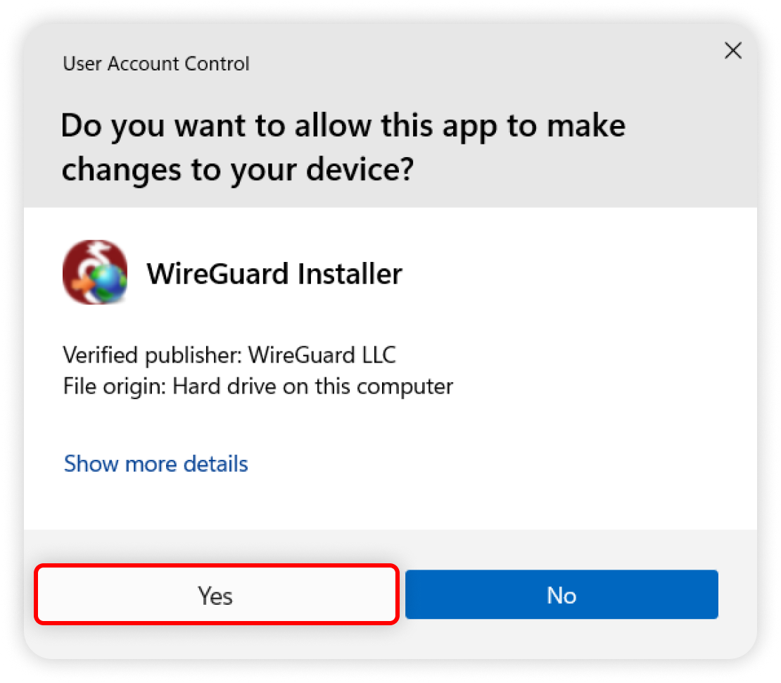 2. Once the download is complete, launch the WireGuard installation file. Once launched, you will receive a pop-up. Click Yes