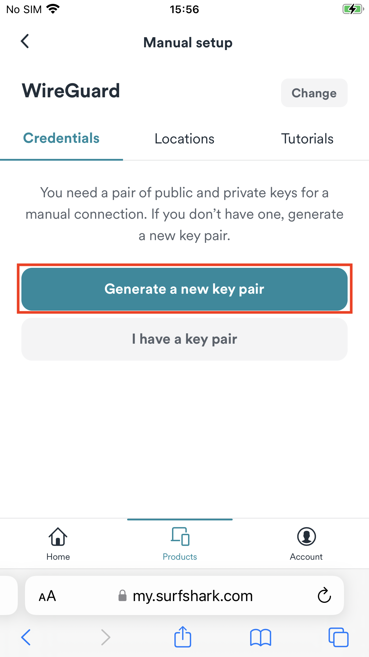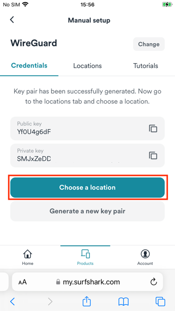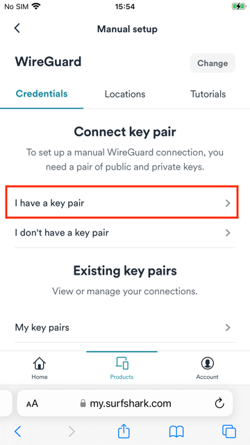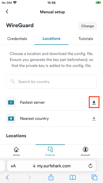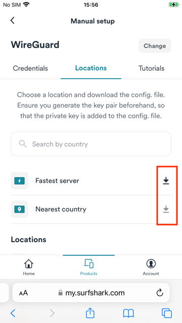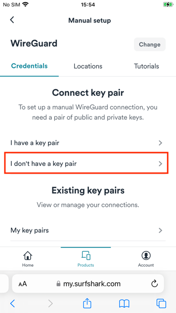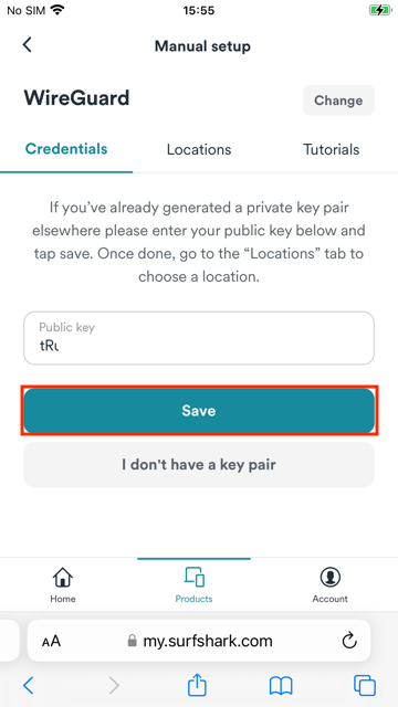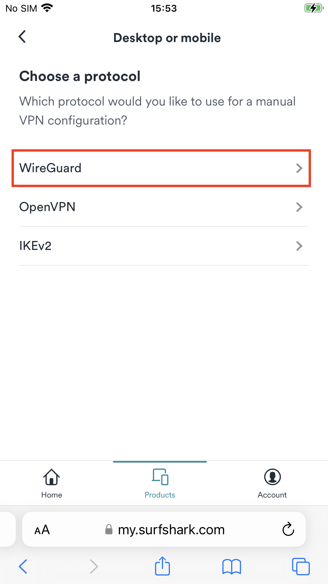 1. Open Safari or any browser on your iOS device, and go to Surfshark's login page. Tap Products > VPN > Manual setup > Desktop or mobile > WireGuard