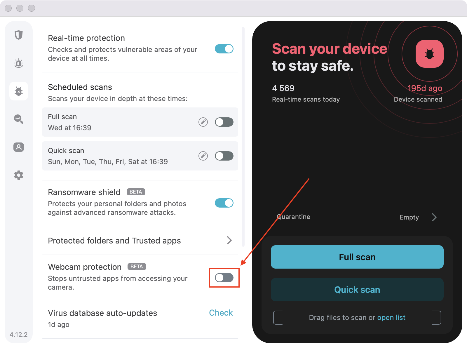 2. Here, you will find the Webcam protection feature. You’ll have to install it if this is your first time using it. Do so by pressing the install button. Then, toggle the switch to enable it.